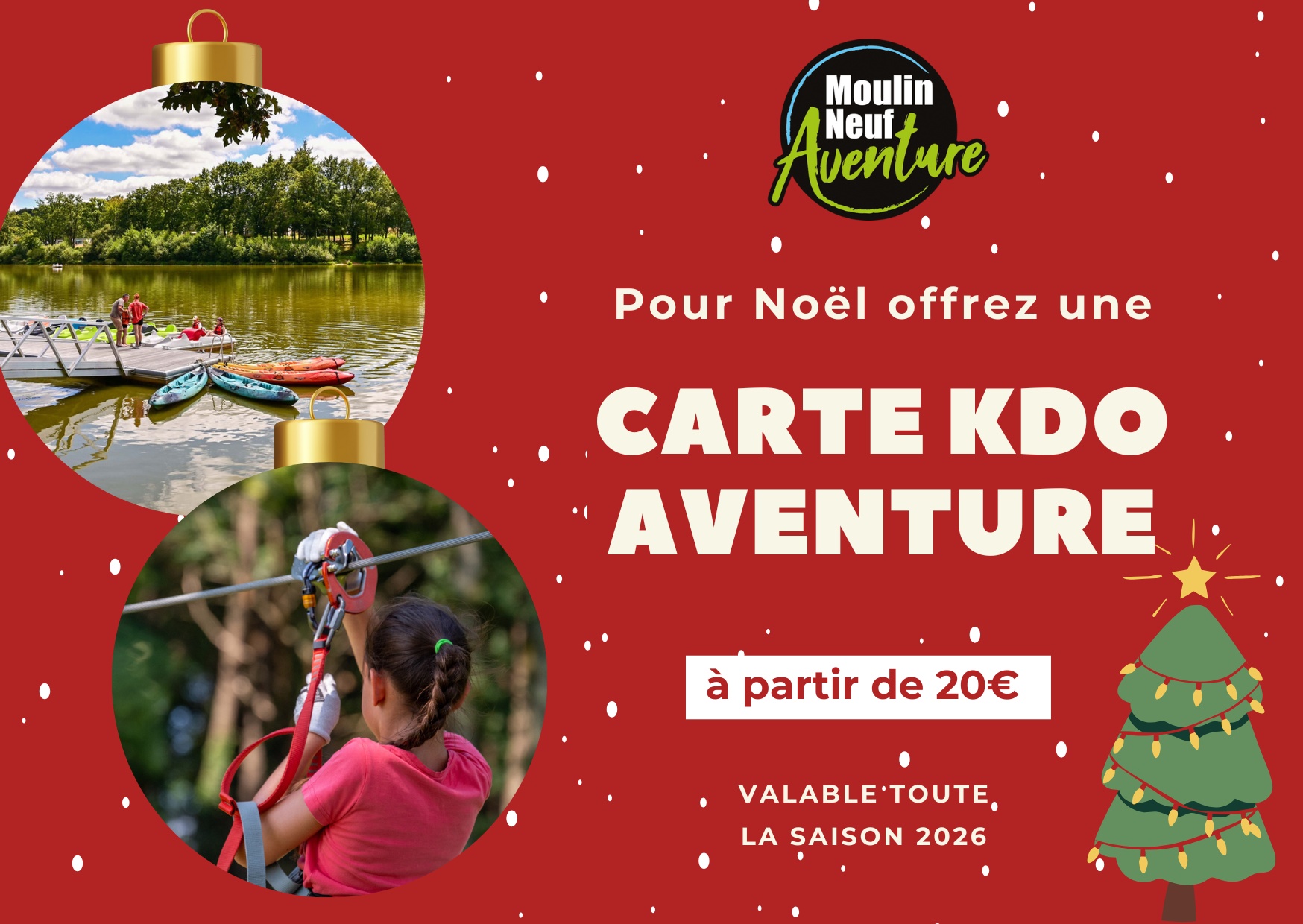 Faites plaisir à vos proches pour Noël et offrez une expérience inoubliable au Moulin Neuf Aventure ! La carte Kdo Aventure est idéal pour ravir à coup sûr petits et grands.