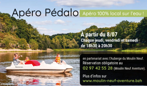 Nouveauté 2021 : Offrez-vous un pause détente sur l’eau, un apéro pédalo,  100% local ! Activité proposée par la base de loisirs en partenariat avec l’Auberge du Moulin Neuf.A partir du 8 juillet, jusqu’au 28 août 2021, chaque jeudi, vendredi et samedi de 18h30 à 20h30. Réservation obligatoire au 02 97 42 55 28 (jusqu’à 18h).